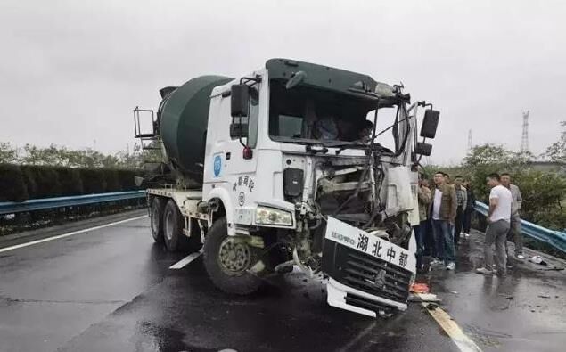 沒想到,隨后而來的一輛水泥攪拌車,經過事發路段,也因為道路濕滑,視線不佳,來不及避讓事故車輛,駕駛員猛打方向,直接撞上了邊護欄,巨大的沖擊力讓水泥攪拌車直接來了個近180度的大轉彎,逆向停在了兩條行車道之間,車輛前臉和駕駛室受損嚴重,所幸駕駛員只是受了輕傷。由于事故車輛將兩條行車道全部占據,一時間二廣高速車輛出現滯留。