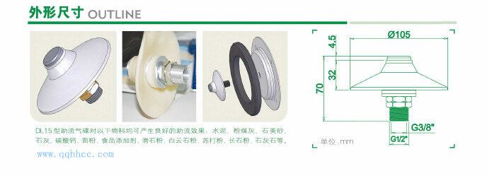 助流氣蝶前部是多孔金屬,外部通入的高壓空氣,經過氣嘴后均勻分散在氣嘴周圍,促使粉料流動,達到助流效果。流化效果由氣嘴數量確定,不同的粉料及容器狀況需要不同數量的氣嘴。本產品具有安裝維護方便,價格低廉、流化效果明顯等突出優點。 是水泥倉頂除塵器,攪拌站倉頂除塵器,以及水泥罐倉頂除塵器重要元件。