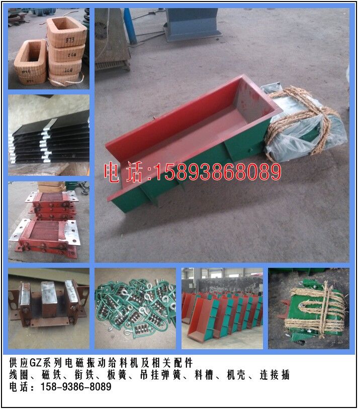 1.板彈簧組:振動器板彈簧是電磁振動給料機的儲能系統。它一般由60Si2Mn制成。彈簧板中部用一螺栓夾在連接叉中,兩端各用一螺栓夾在機殼上,構成機器的彈性系統。板彈簧電磁振動給料機,通常利用增加或者減少板彈簧片數的方法來調整機器的頻率比。