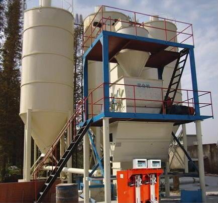 騰飛集團(tuán)膩?zhàn)臃凵a(chǎn)設(shè)備年產(chǎn)兩到三萬噸左右的膩?zhàn)臃凵a(chǎn)設(shè)備,一般情況下會用到4-6個(gè)原料罐,其中兩個(gè)大罐用于裝放散裝水泥和粉煤灰,其余小罐用于裝放輕鈣、 重鈣、砂、小料等。散裝水泥和粉煤灰進(jìn)罐不需要提升設(shè)備,依靠泵車打入。輕鈣、重鈣、砂、小料等需要使用斗式提升機(jī)提入小罐,巧妙的物料分配系統(tǒng)支持一個(gè)斗式提升機(jī)分配式作業(yè),從而避免了資源浪費(fèi)。