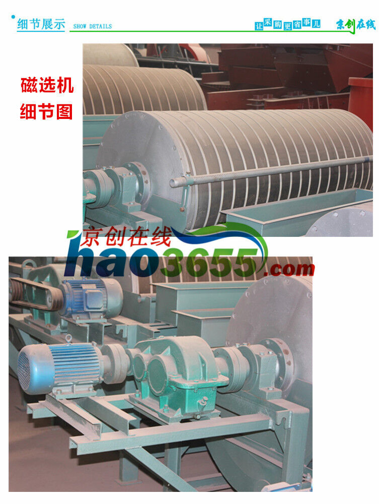 濕式永磁筒式磁選機主要由圓筒、磁系、槽體、傳動部分四部分組成。圓筒由2-3mm不銹鋼板卷焊成筒,端蓋為鑄鋁件,用不銹鋼螺釘和筒相連。電機通過減速機,帶動圓筒作回轉運動。磁系為開放式磁系,裝在圓筒內。磁塊用不銹鋼螺栓裝在磁軛的底板上,磁軛的軸伸出筒外,軸端固定有拐臂。扳動拐臂可以調整磁系偏角,調整合適后可以用拉桿固定。槽體的工作區域用不銹鋼板制造,機架和槽體的其他部分用普通鋼材焊接。