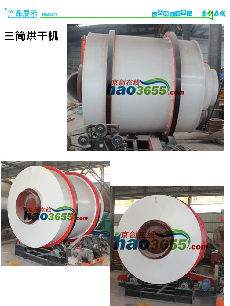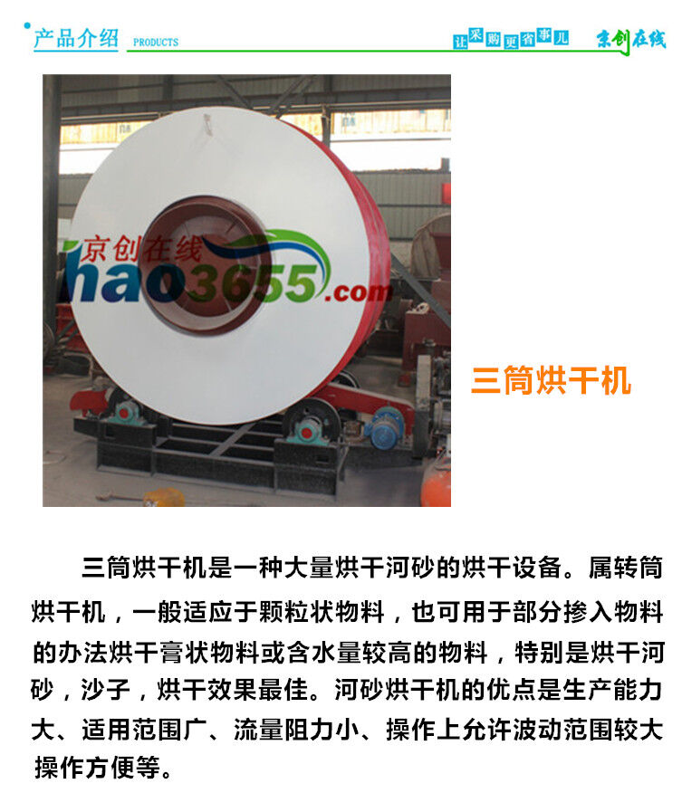 YHS6210三筒烘干機YHS6210在濕物料烘干設備系列產品中,回轉式三筒烘干機是在單筒回轉式烘干機基礎上改進的高效節能產品。經多家企業、多個行業的應用,取得了良好的效果。回轉式三筒烘干機改進了單筒原單筒烘干機內部結構,增加入機前濕料的予烘干和延長濕料在機內烘干時間,再加上密封、保濕以及合理的配套措施,使烘干機生產能力與原單筒式烘干機相比,提高50-80%,單位容積蒸發強度可達120-180kg/m3,標準煤耗僅為6-8kg/t。其技術先進、運行參數合理,操作簡單可行。“科恒機械”制造的三筒烘干機筒體體內根據用戶需求不同,內部可以設計配備使用耐高溫材料隔溫,在進料端為防止倒料設有門圈及螺旋抄板。具有結構合理,制作精良,產量高,能耗低,運轉方便等優點。另外我公司的研發部門經過多年的不懈努力,可將鍋爐尾氣做為三筒烘干機的供熱熱源,成功推出利用鍋爐廢氣烘干機。是供熱無投資,用熱無成本。真節能干燥,真正節能環保。可用于廣泛應用于各個行業的礦渣、粘土、煤、鐵粉、礦粉及其它混合材,建筑業的干混砂漿,黃砂等以及化工、鑄造等行業原材料烘干。