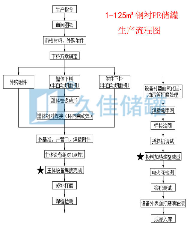 工藝: 鋼襯塑儲罐是以聚乙烯(PE)/聚烯烴(PO)為原料,采用旋塑工藝(滾塑技術)一次整體成型。將鋼網焊接于鋼體表面,使鋼體表面、鋼、網、塑復合形成一個整體。