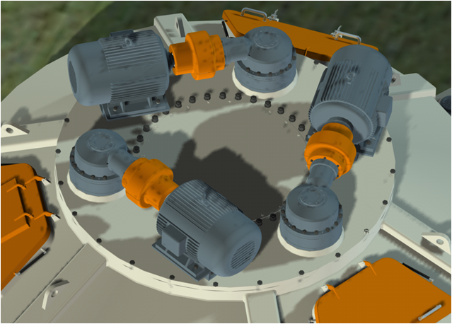 ④對(duì)于大型立軸行星式攪拌主機(jī),我們采用多電機(jī)驅(qū)動(dòng),其起動(dòng)平穩(wěn)、可靠性高。獨(dú)特的電機(jī)臥式安裝結(jié)構(gòu),有效降低了攪拌主機(jī)的整體高度,方便運(yùn)輸和安裝及攪拌主機(jī)進(jìn)料系統(tǒng)布局,維修更加簡(jiǎn)便,該主機(jī)結(jié)構(gòu)設(shè)計(jì)我公司已獲專(zhuān)利。
