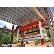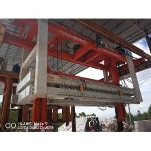 移動式掰板機工作流程:蒸養(yǎng)完成的成品連同模具側板被模具側板運輸裝置送至移動掰板機下,頂升裝置啟動,將坯體連同側板頂起,移動掰板機從上層至下層依次掰開,掰至底層后,移動掰板機將全部成品夾起,并移至砌塊成品打包線上,將砌塊放置在該打包線上,移動掰板機繼續(xù)將加氣板移動至加氣板輸送打包線上,重新返回。掰扳機專門負責坯體切開之后(經(jīng)蒸養(yǎng))又重新粘連在一起,在自動打包之前將其一塊一塊分離,消除由于粘連造成的廢、次品,同時保證打包線正常運行。