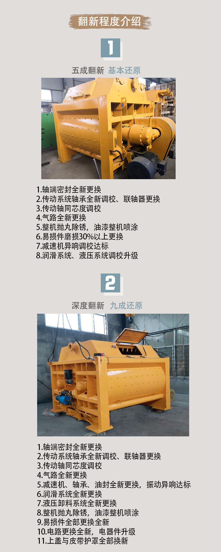 隨著國家基礎建設的大力推進,攪拌站轉場的速度也在加快,有些攪拌機使用2-3年就被閑置,未能發揮出他的最優性能。一些攪拌機的主要部件性能任然很好。為了將這一部分設備重新利用,我公司擁有專業的人員、評估、回收、檢修、然后再以嶄新的面貌服務客戶。