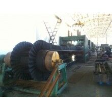 大傾角波狀擋邊帶由基帶、擋邊、橫隔板3部分組成。擋邊起防止物料測滑撒落的作用。為便于繞過滾筒,檔邊設計成波紋狀;橫隔板的作用是承托物料,為了實現大傾角輸送,采用T型TC型。檔邊和橫隔板是用二次硫化的方法與基帶連接的,具有很高的連接強度。