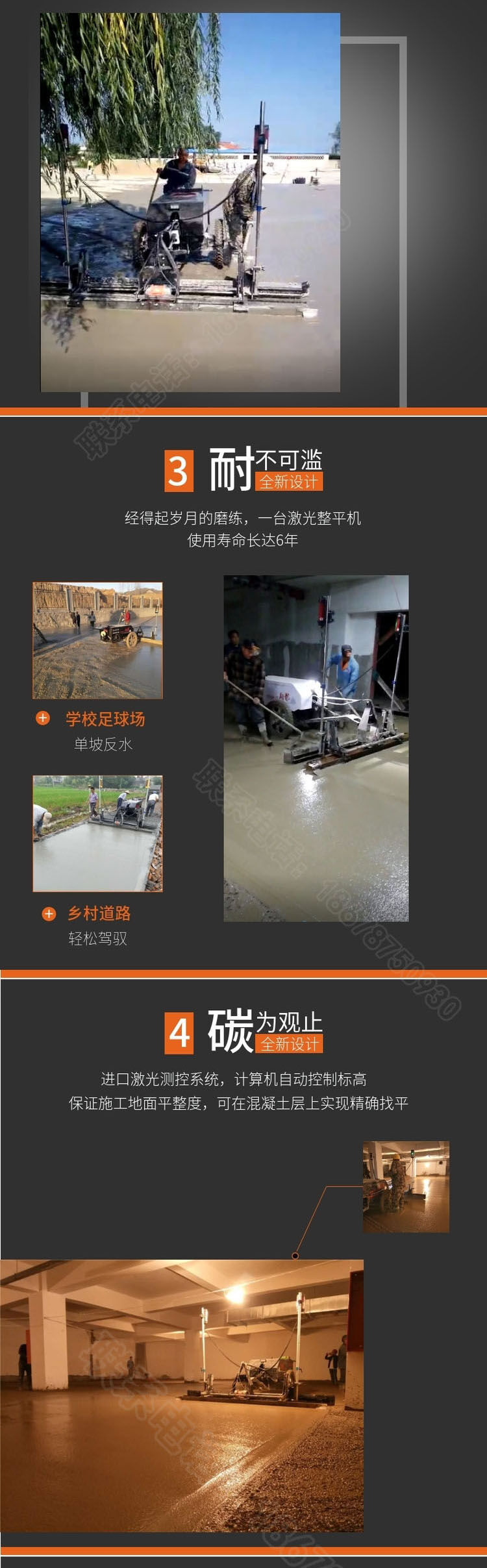 四、地面更密實均勻:每分鐘4000次的高頻振動器,讓整平頭振動器產(chǎn)生均勻的高頻振搗,使得混凝土地面更密實均勻。作為混凝土激光整平機設(shè)的領(lǐng)跑者,激光整平機可實現(xiàn)大面積施工,通過一次解決砼面層,徹底清理了二次做法所帶來的所質(zhì)量通病,我們會一如既的為客戶提供可信賴的產(chǎn)品和更完善的服務。