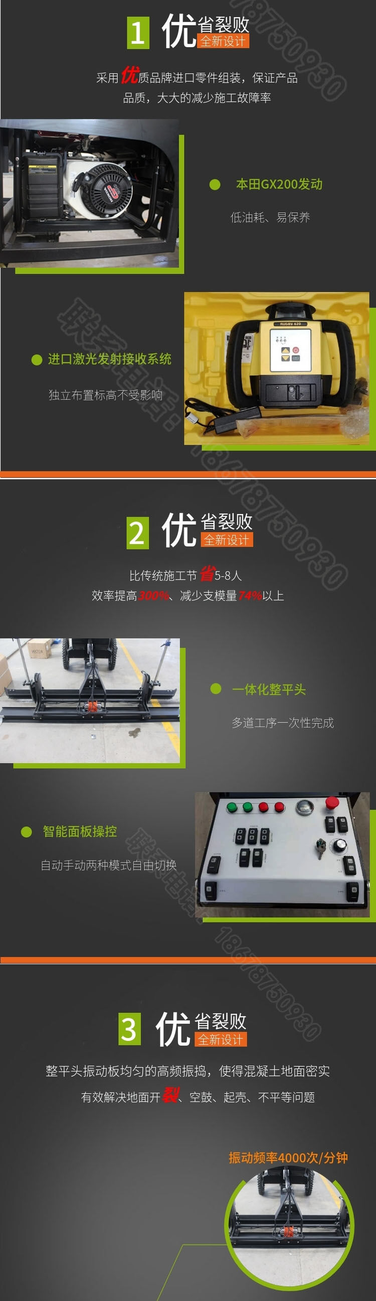 一、減少人力成本,翻倍提高效率:傳統(tǒng)工藝施工人數(shù)較多,需要支模板(槽鋼)、打點、攤鋪。需要人力20人左右。每天施工面積在700平方。采用混凝土激光整平機總?cè)藬?shù)比傳統(tǒng)工藝減少一多半。可單人操作。每天施工面積在2500---3500平,大大降低了人力成本。