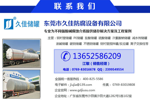4、鋼襯塑儲罐耐腐蝕性能好,耐腐蝕介質面廣。耐硫酸和稀硝酸,耐任何濃度的鹽酸、氫氟酸、磷酸、甲酸、醋酸、胺類、過氧化氫、氫氧化鈉、氫氧化鉀以及這種鹽類的溶液,在攝氏60度以下能耐多種濃度的堿溶液及50%的硫酸,10%的硝酸。具體介質、濃度等歡迎您的咨詢!