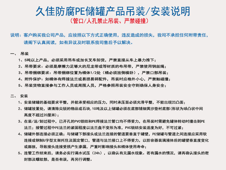 久佳防腐是華南一家堅持使用韓國644全新PE料的企業,也是華南堅持采用底部出料管口整體一次成型的企業,主要產品有:聚乙烯儲罐、鹽酸儲罐、塑料儲罐、減水劑儲罐、外加劑儲罐、鋼襯塑儲罐、不銹鋼儲罐、碳鋼儲罐、鋼襯塑攪拌罐、鋼襯塑反應罐、離子交換柱等產品;具有無焊接縫、不滲漏、無毒性、重量輕、抗老化、抗沖擊、耐腐蝕、壽命長等特性。