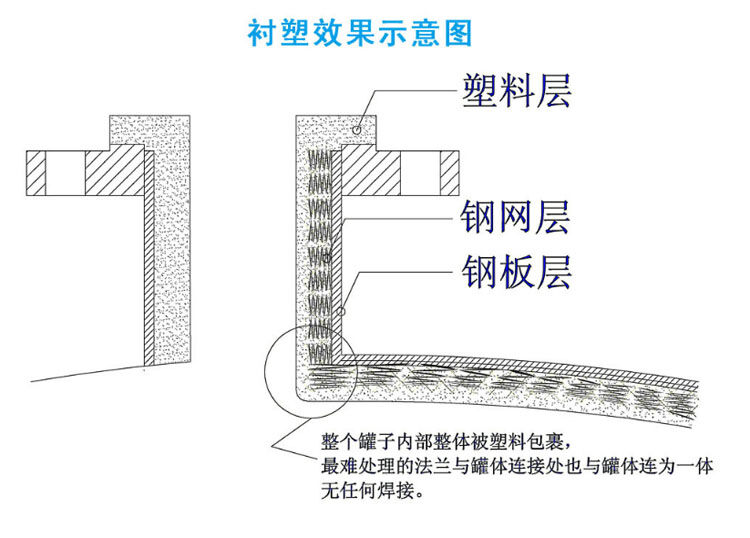 鋼襯塑產品一般由桶身、平底、封頂、人孔、進料口法蘭、出料口法蘭和液位孔口法蘭組成,臥室鋼襯塑儲罐通常還有標準鋼質支座。鋼襯塑產品一般根據用戶要求設計制造。