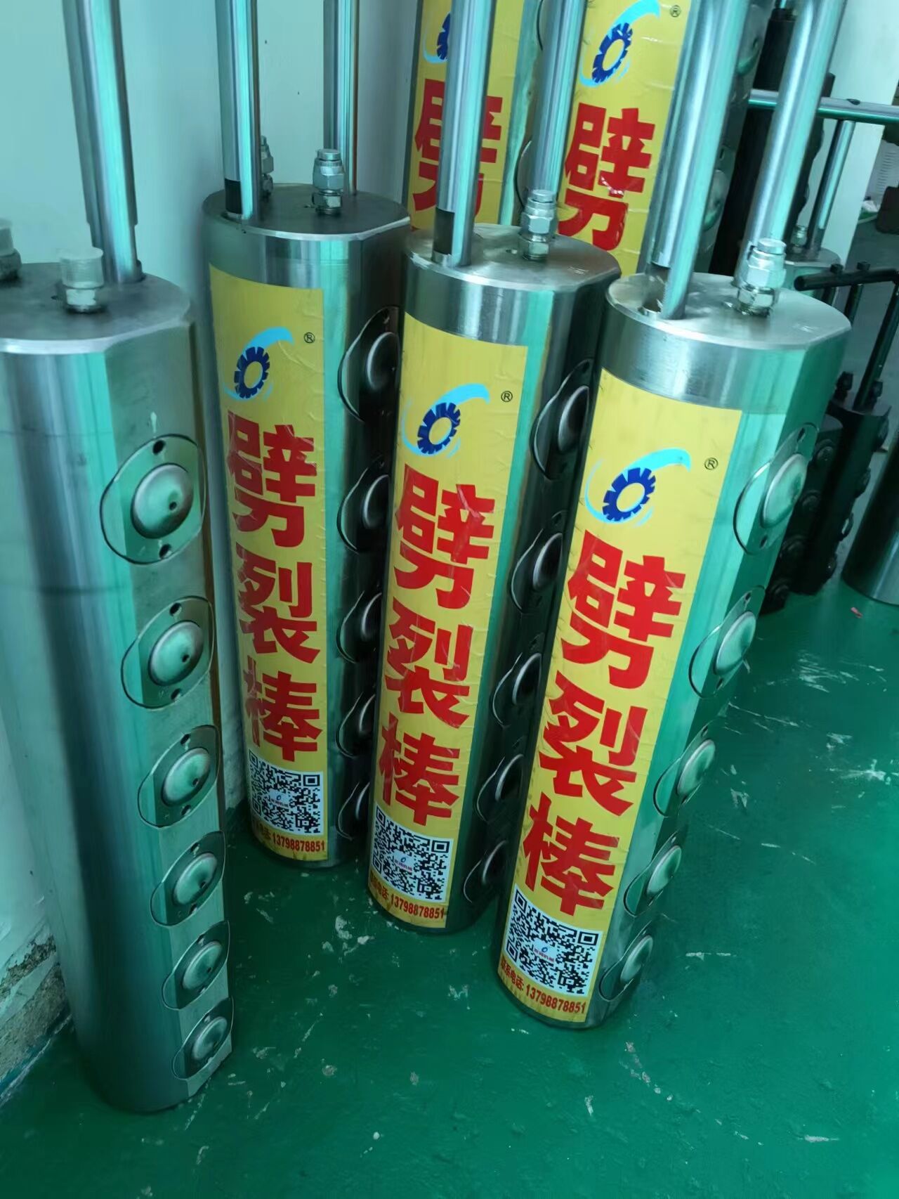 液壓柱塞式棒原理及組成液壓柱塞式棒主要由液壓泵站和劈裂器(棒)兩部分組成。120-150MP超高壓油泵站輸出的高壓油驅動油缸產生巨大推動力(1300-1500噸),并推動劈裂棒上的活動活塞向外運動,從而使活塞產生的作用力作用于被體孔壁,巖石在巨大的作用力下按預定方向裂開。