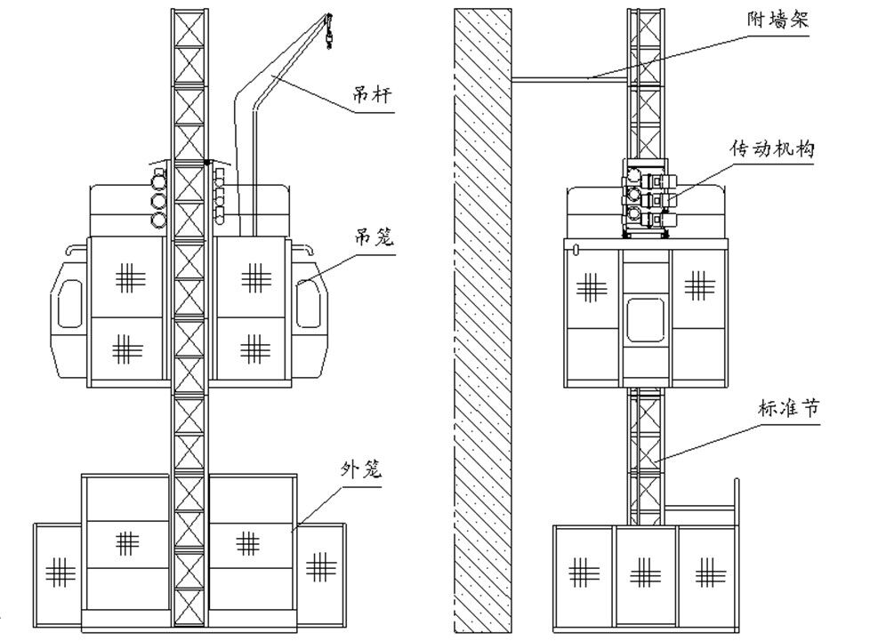 變頻無級調速施工升降機 性能特點;提升速度快; 啟、制動平穩、無沖擊; 啟動電流小于額定電流; 機械磨損降低,由于啟動時無沖擊,大大降低了齒輪、齒條等機械磨損; 能源節約效果明顯。