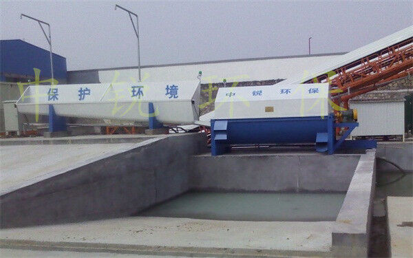 該系統主要由:攪拌車加水清洗裝置,溜槽輸送裝置,砂石漿水分離裝置,和泥漿水后處理裝置組成。混凝土輸送設備清洗后,將殘余混凝土排入溜槽中,在高壓水流沖擊下,經溜槽進入砂石分離機,在不斷旋轉的分離機作用下,對混凝土進行充分的清洗,同時將砂、石進行分離,分離后的砂、石在導料葉片的作用下背向流動,再通過提升式出料口排出分離機,分別堆放。清洗后的漿水從分離機的底部排出進入沉淀池逐級沉淀后循環使用或進入攪拌池回收利用。進入攪拌池(一般情況2個攪拌池)的漿水為了防止沉淀凝固,需通過攪拌器的作用,攪拌器的工作為間歇式。分離出水泥漿在連續的攪拌器作用下,再通過高壓污水泵輸送到攪拌樓中待生產計量再利用。整個控制系統設有手動和自動控制,方便控制設置,整個系統運行可靠,故障率低,維護量少等特點。