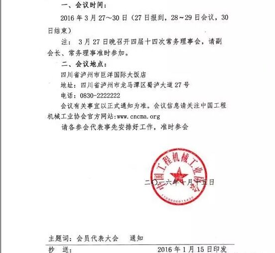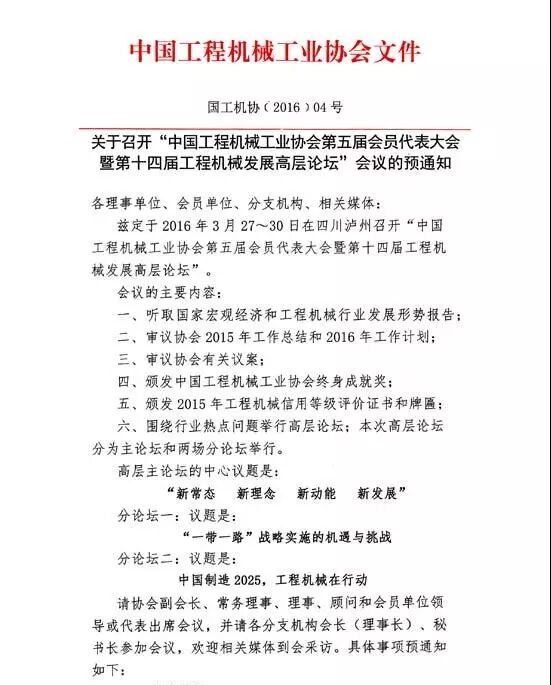 茲定于2016年3月27日~30日在四川瀘州召開“中國工程機械工業協會第五屆會員代表大會暨第十四屆工程機械發展高層論壇”。