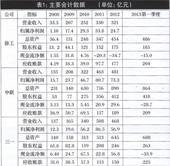分析表3中數(shù)據(jù),參考近年三駕馬車資金投向,隱含在數(shù)據(jù)后面的一個事實就浮出水面:經(jīng)過幾年布局,各有斬獲后,出于做大做強(qiáng)企業(yè),保優(yōu)勢、補(bǔ)短板需要,挖掘機(jī)市場將是徐工、中聯(lián)的發(fā)力點(diǎn);徐工還將全面進(jìn)入混凝土機(jī)械市場,2012年報顯示,其占比首次達(dá)到12%;三一則必然會在起重機(jī)市場加在投入,另外其路面機(jī)械也對徐工形成沖擊態(tài)勢。作為行業(yè)領(lǐng)跑者,三駕馬車都在投巨資、博市場,期待追平或拉開與對手的距離。這就是三駕馬車現(xiàn)金流量表中,投資活動現(xiàn)金流量長期負(fù)數(shù)的主要原因。