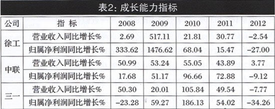 公司的成長與盈利能力正相關(guān)。在年報中,主營業(yè)務(wù)收入增長率、凈利潤增長率、凈資產(chǎn)增長率以及凈資產(chǎn)收益率、毛利率、凈利率等財務(wù)指標(biāo),是判斷企業(yè)成長性和盈利能力的重要指標(biāo)。表2顯示,三駕馬車中,5年主營業(yè)務(wù)收入同比增長率實現(xiàn)連續(xù)5年正增長、連續(xù)三年保持30%以上增長率的公司是中聯(lián),五年中增長率振幅最大的公司是徐工,2012年徐工和三—主營業(yè)務(wù)收入增長率均出現(xiàn)負(fù)增長;表2還顯示,凈利潤同比增長率方面,沒有—家公司連續(xù)五年正增長,2012年三駕馬車同時出現(xiàn)負(fù)增長,三一錄得-34.26%的最大降幅。在大環(huán)境不利因素作用下,公司成長性受到嚴(yán)峻挑戰(zhàn)(見圖2)。