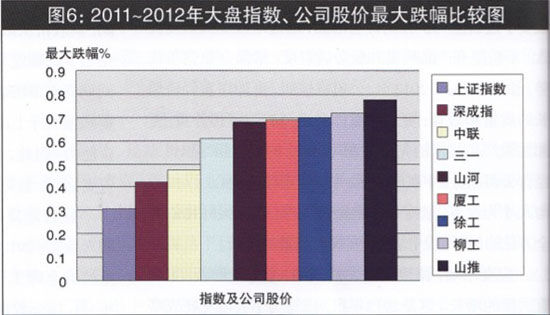 2011年,行業(yè)遭遇寒冬,三駕馬車營業(yè)收入合計增三率與宏觀經(jīng)濟(jì)指標(biāo)對比,呈加速度下跌態(tài)勢,而且在資本市場的表現(xiàn)弱于滬深大盤指數(shù)。2011年~2012年間,其股價從最高點(diǎn)至最低點(diǎn),下跌47.3%、61.2%、69.8%不等;而同期上證指數(shù)下跌幅度只有30.67%,深成指下跌42.1%。盡管與行業(yè)內(nèi)其他上市公司同期資本市場表現(xiàn)相比,工程機(jī)械行業(yè)三駕馬車的表現(xiàn)仍有亮點(diǎn),但其同期跌幅大于上證和深成指跌幅,仍然令公司形象受損,影響資本市場再融資能力。因此,打造公司核心競爭力,提升公司投資價值,提振資本市場投資者信心,至關(guān)重要(大盤指數(shù)、公司股價最大跌幅比較圖,見圖6)。