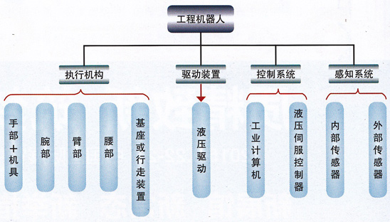 工程機器人的基本特征是液壓驅動、遙操作、移動作業,具有大功率作業、寬范圍作業、多功能作業和智能作業的特點。